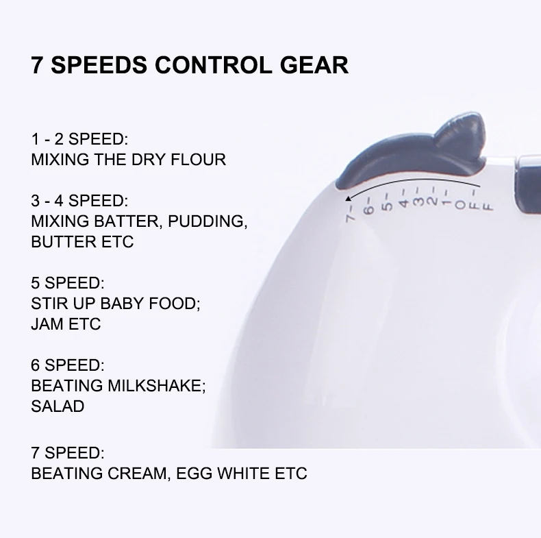 1.7 mixing speeds, combine ingredients at speed one for slowly stirring in chunky ingredients, speed four for mashing potatoes, speed seven for beating egg whites and whipping meringue.